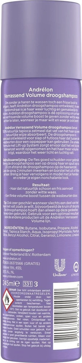 Deze droogshampoo is niet alleen geschikt voor een verfrissende boost tussen de wasbeurten door, maar kan ook gebruikt worden als haarstyling, wanneer je haar niet valt zoals gehoopt. Vet wordt bij de haaraanzet opgenomen, waardoor het haar meer volume krijgt en weer licht en luchtig valt. Het resultaat na gebruik van de droogshampoo is fris, licht en ‘ready to go’ haar vol volume. Als je haar echt goed zit, heb je het gevoel dat je de hele wereld aan kan. Deze fles is 100% recyclebaar, gooi de fles dus weg bij het plastic afval. Andrélon is het meest verkochte haarverzorgingsmerk in Nederland. Met een uitgebreid assortiment shampoos, conditioners en stylingproducten biedt Andrélon je een uitgebreide haarverzorging voor elk type haar.