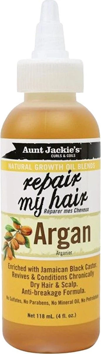 Aunt Jackies Natural Growth Oil Blends Repair My Hair met Argan. Argan olie is effectirf om de haargroei te stimuleren, terwijl het haar glanst en de gezondheid van de hoofdhuid verbetert. Rijk aan vitamine E, helpt het om droog, bros haar te verjongen, waardoor het zachter en gladder wordt. Versterkt met Jamaicaanse Black Castor Oil, om chronisch droog haar te behandelen, is deze olie geschikt voor ieder haartype.