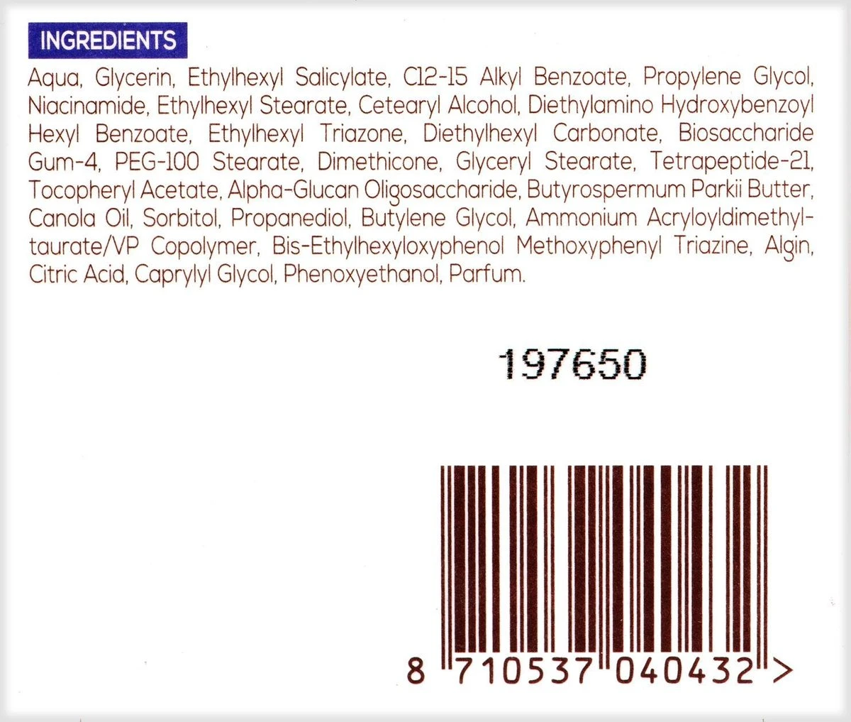 Aqua, Diethylhexyl Carbonate, Niacinamide, Ethylhexyl Salicylate, Neopentyl Glycol Diheptanoate, Glycerin, Cetyl Dimethicone, Propylene Glycol Dibenzoate, Dimethicone, Diethylamino Hydroxybenzoyl Hexyl Benzoate, Ethylhexyl Triazone, Propanediol, Cetearyl Olivate, 1,2-Hexanediol, Bis-Ethylhexyloxyphenol Methoxyphenyl Triazine, Sorbitan Olivate, Butyrospermum Parkii Butter Extract, Canola Oil, Butyrospermum Parkii Butter, Limnanthes Alba Seed Oil, Pentaerythrityl Tetraisostearate, Hydrolyzed Hyaluronic Acid, Ascorbyl Tetraisopalmitate, Tocopheryl Acetate, Xylitylglucoside, Anhydroxylitol, Xylitol, Glucose, Glyceryl Stearate, Sucrose Stearate, Ammonium Acryloyldimethyltaurate/VP Copolymer, Acrylates/C10-30 Alkyl Acrylate Crosspolymer, Xanthan Gum, Citric Acid, Sodium Benzoate, Parfum.