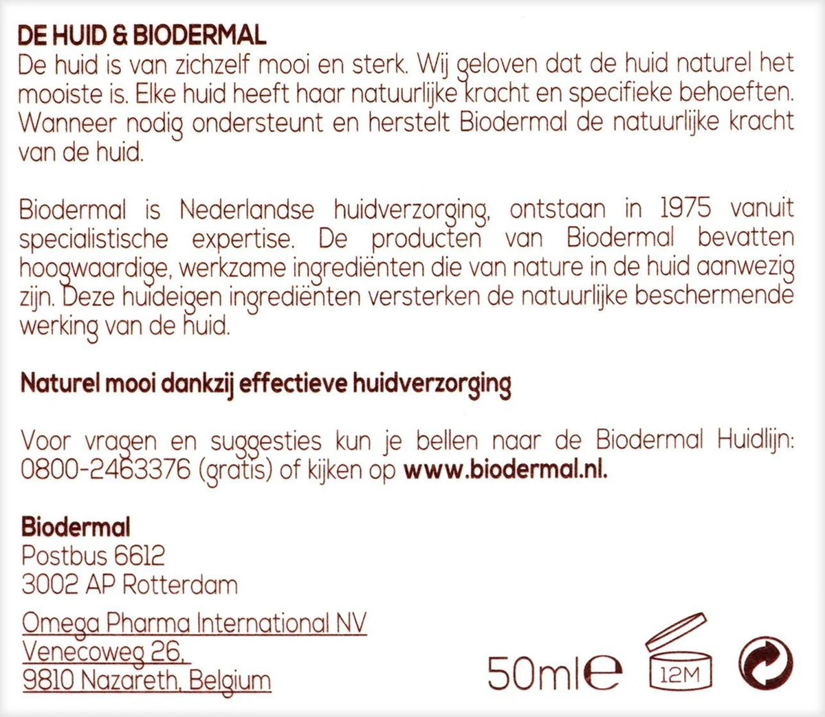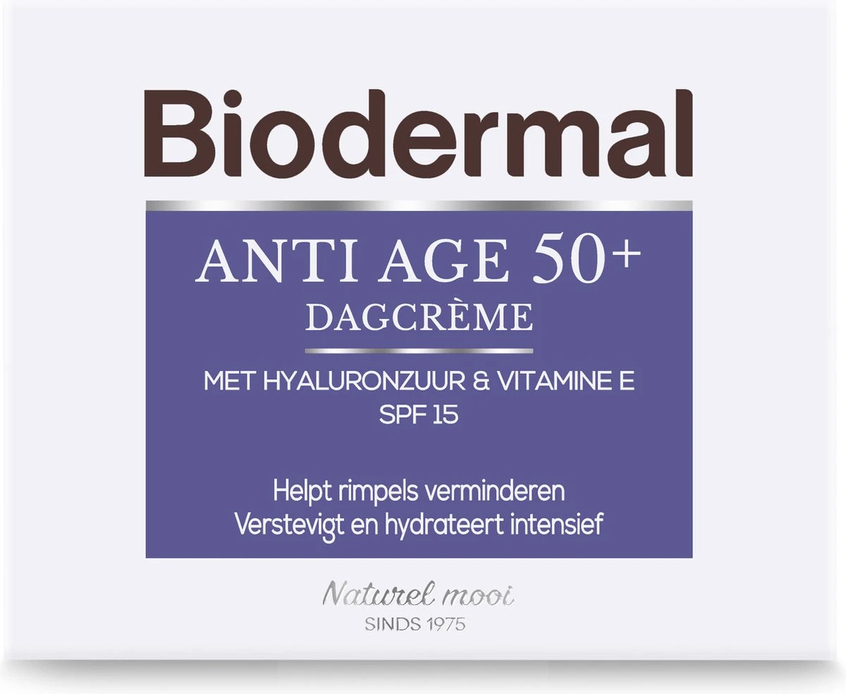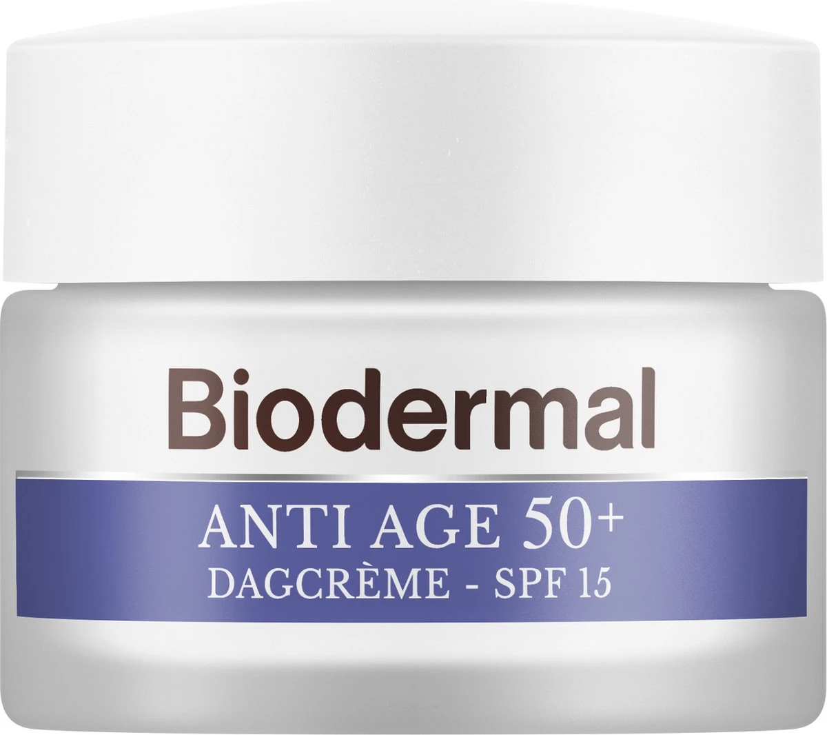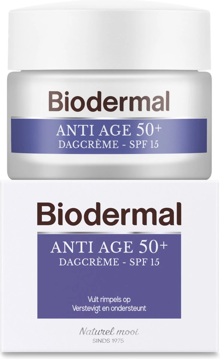 Het verouderingsproces versnelt vanaf het 50e levensjaar. De huid is droger, dunner en heeft een sterk verminderde veerkracht. Biodermal Anti Age 50+ dagcrème ondersteunt de huid effectief gedurende de dag. De rijke formule hydrateert intensief en helpt rimpels zichtbaar te verminderen. De crème verbetert de huidelasticiteit en egaliseert de huidteint. Met als resultaat een huid die stralender oogt en gladder, soepeler en voller aanvoelt. Bevat SPF 15: beschermt tegen UVA- en UVB-straling.