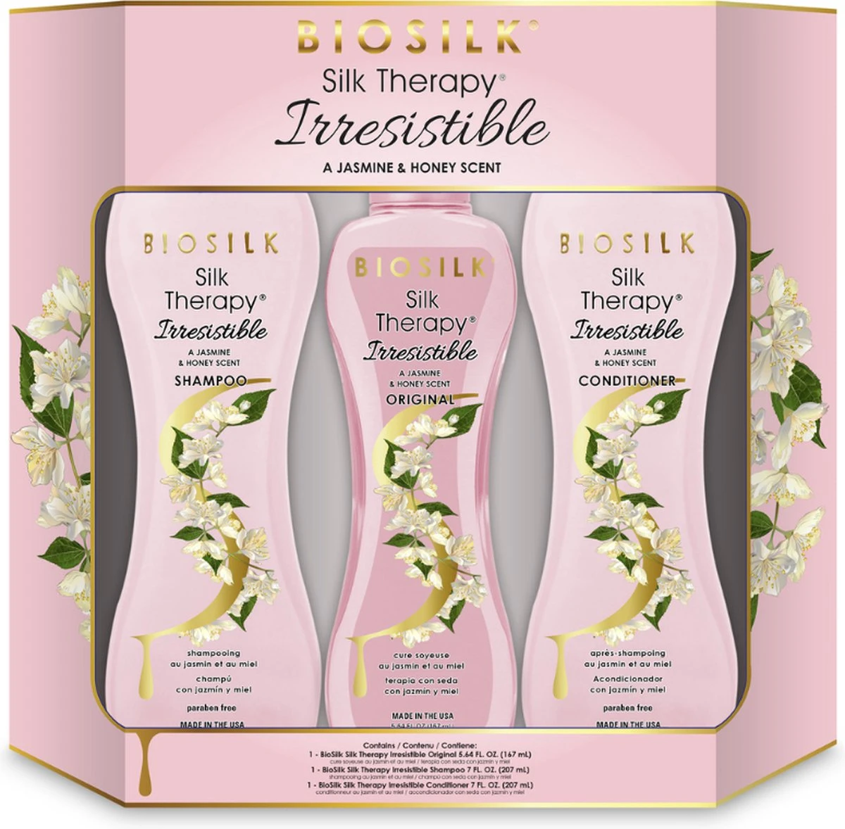 BioSilk Silk Therapy Irresistible Trio Kit bevat de heerlijke geur van jasmijn en honing, waardoor je haar onweerstaanbaar wordt! De Irresistible Silk Therapy collectie zal je schoonheid van binnen en van buiten doen ontwaken en je haar voorzien van de essentiële ingrediënten om het vocht in alle haartypes en texturen aan te vullen.
