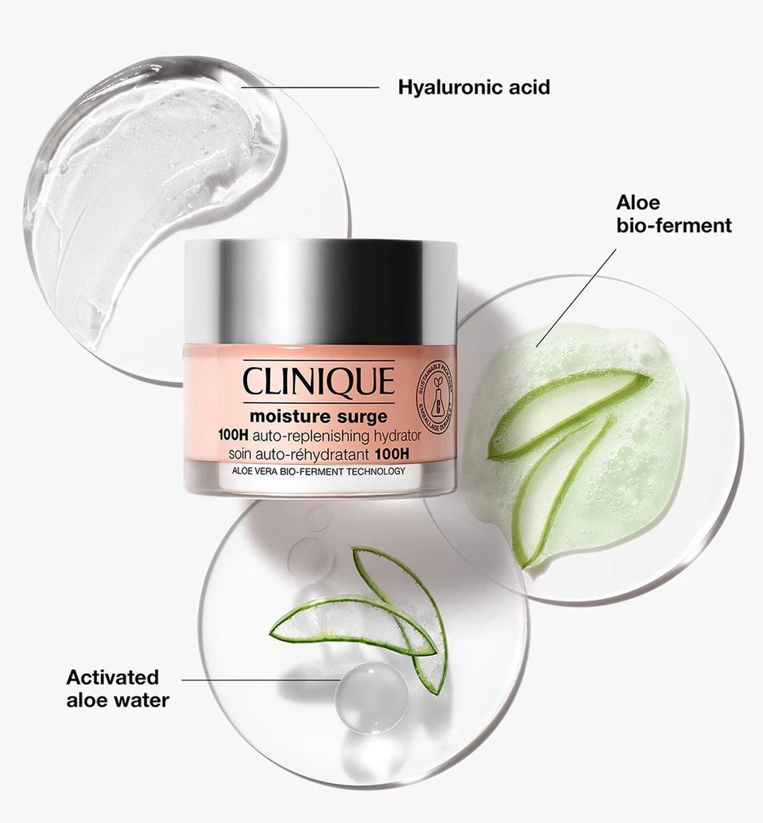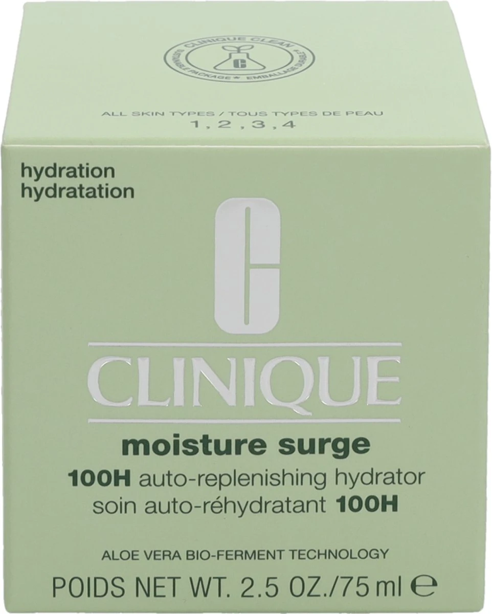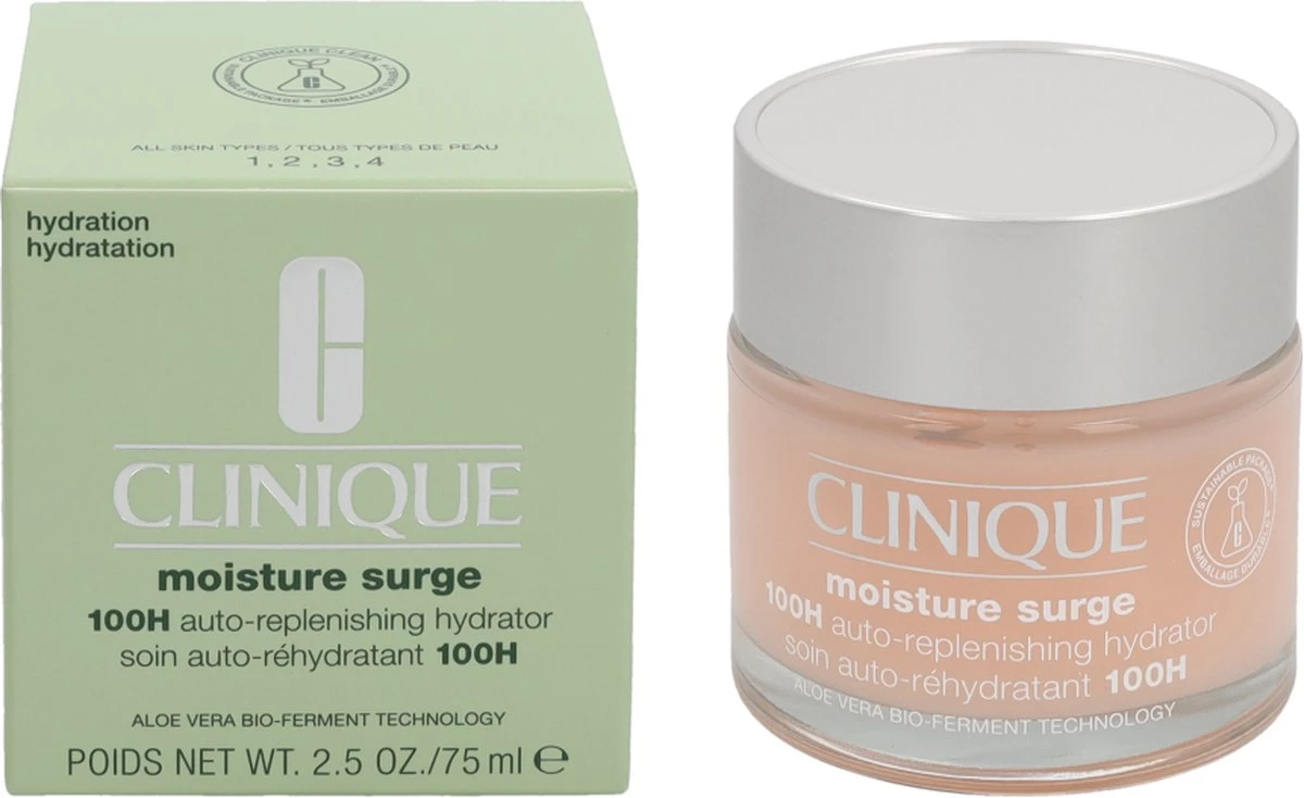 Moisture Surge 100H Auto-Replenishing Hydrator is een upgrade van de verfrissende fan-favoriet van Clinique, deze olie-vrije gel-crème moisturizer met exclusieve aloë bio-ferment en hyaluronzuur dringt diep door in het huidoppervlak voor een hydratatie die meer dan 10 lagen diep gaat* en 100 uur houdt, zelfs na het wassen van uw gezicht.
