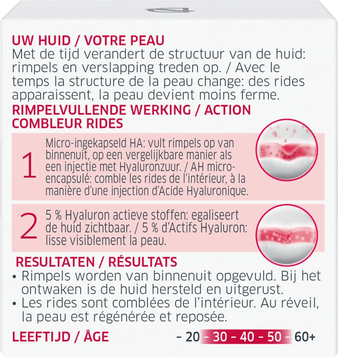 Pro-Collageen stimuleert de productie van collageen en vult rimpels op. Het Micro-Geïnjecteerd HA is een kogeltje dat de huid binnendringt en door op te zwellen rimpels van binnenuit opvult, op een gelijkaardige manier als een injectie met hyaluronzuur. Voor een langdurig verstevigde huid. Na een intensief herstel tijdens de nacht, ziet de huid er ook ochtends stralend uit.