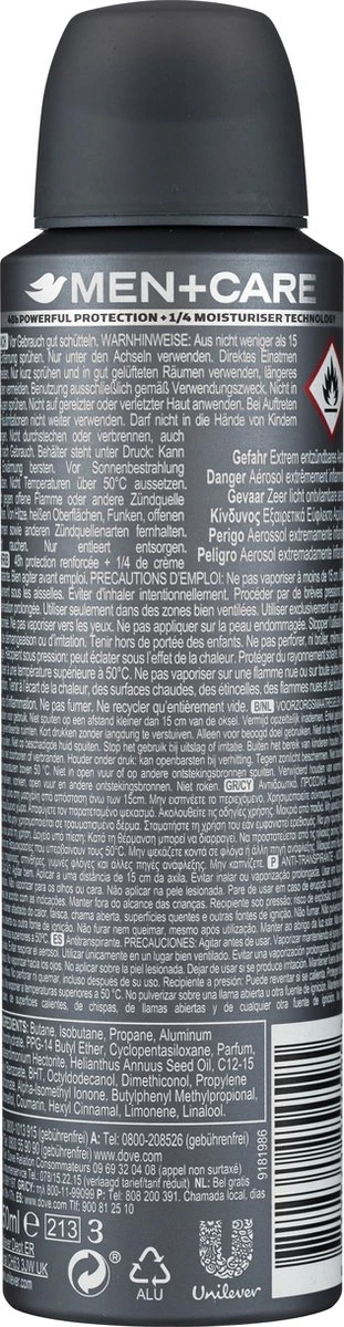 - Deze Dove Men+Care anti-transpirant spray bevat 1/4 voedende Dove crème