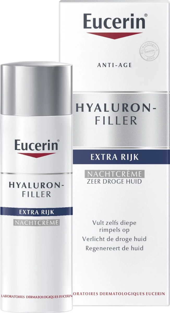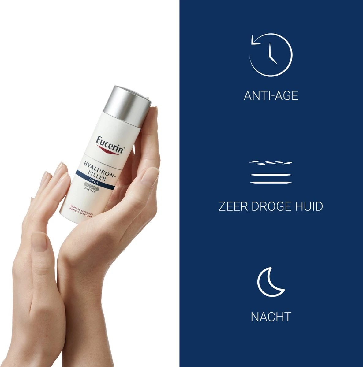 Eucerin Hyaluron-Filler Urea Antirimpel Nachtcrème heeft een formule voor mensen met een zeer droge huid met rimpels. Ureum houdt vocht vast, hyaluronzuur vermindert droogtelijntjes en ceramide-3 regenereert de huid gedurende de nacht. Hyaluron-Filler Urea Antirimpel Nachtcrème wordt goed verdragen en is zelfs geschikt voor mensen met psoriasis. Door de zachte textuur van de crème voelt de huid aangenaam aan.