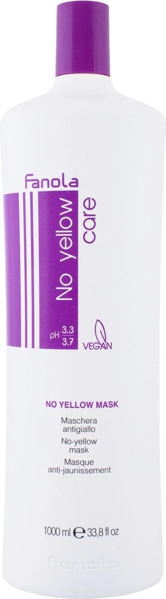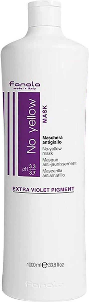 De Fanola No Yellow Mask is de anti-geel masker voor gebleekt, blond of grijs haar. Het masker kan worden gebruikt bij highlights, balayage, grijs haar, coupe de soleil en blond (geblondeerd) haar. De ijs, grijs en as tonen worden langer behouden. Het masker is geformuleerd met speciale violet pigmenten dat de ongewenste gele tinten neutraliseert. Het haar krijgt een keole, zilverachtige blonde tint en de gele kleur verdwijnt uit het haar. Het product heeft een zeer aangename geur en is niet schadelijk voor het haar. De Fanolo Mask Maschera Antigiallo is niet alleen een anti-geel masker maar brengt glans en zachtheid terug. Professionals raden aan om naast shampoo en conditioner, ook een haarmasker te gebruiken.