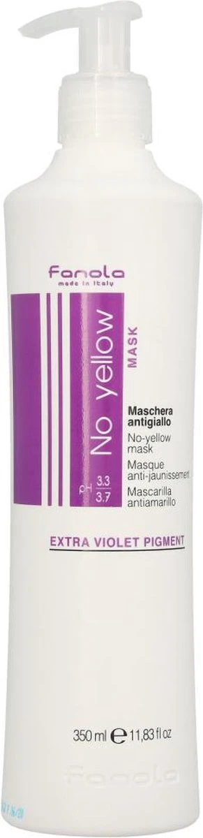De Fanola No Yellow Mask is de anti-geel masker voor gebleekt, blond of grijs haar. Het masker kan worden gebruikt bij highlights, balayage, grijs haar, coupe de soleil en blond (geblondeerd) haar. De ijs, grijs en as tonen worden langer behouden. Het masker is geformuleerd met speciale violet pigmenten dat de ongewenste gele tinten neutraliseert. Het haar krijgt een keole, zilverachtige blonde tint en de gele kleur verdwijnt uit het haar. Het product heeft een zeer aangename geur en is niet schadelijk voor het haar. De Fanolo Mask Maschera Antigiallo is niet alleen een anti-geel masker maar brengt glans en zachtheid terug. Professionals raden aan om naast shampoo en conditioner, ook een haarmasker te gebruiken.