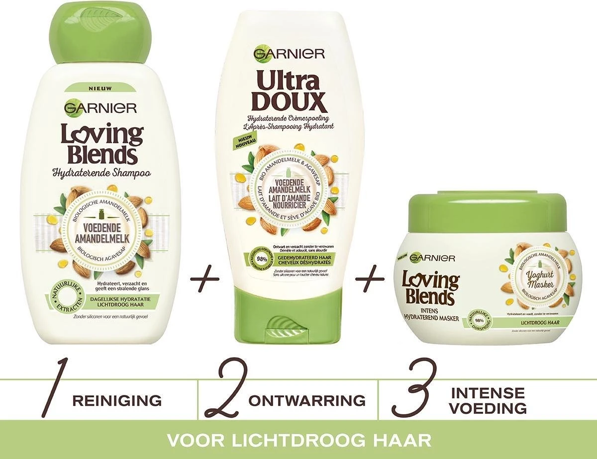 Het Garnier Loving Blends Voedende Amandelmelk Yoghurt Masker is speciaal ontwikkeld voor hydratatie van lichtdroog haar. Het haar wordt intens gevoed en voelt dag na dag zachter aan.