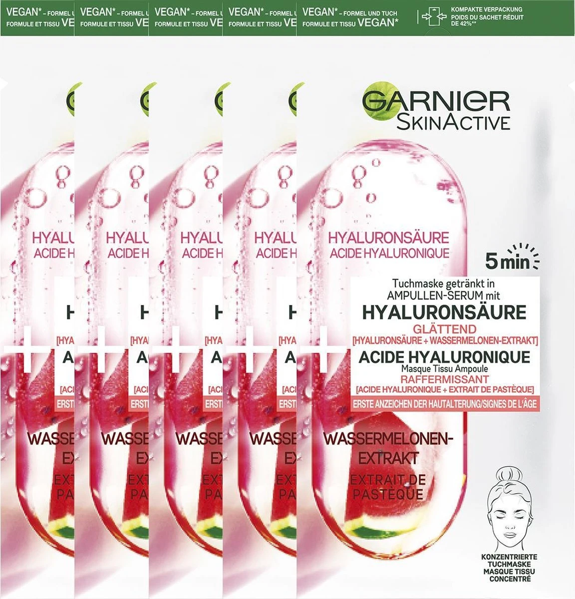 De werking van het Garnier Sheet Mask gezichtsmasker met hyaluronzuur en watermeloenextract is bewezen doeltreffend: in 5 minuten voelt de huid steviger en gerevitaliseerd aan. Ook droogtelijntjes lijken zichtbaar verminderd*.