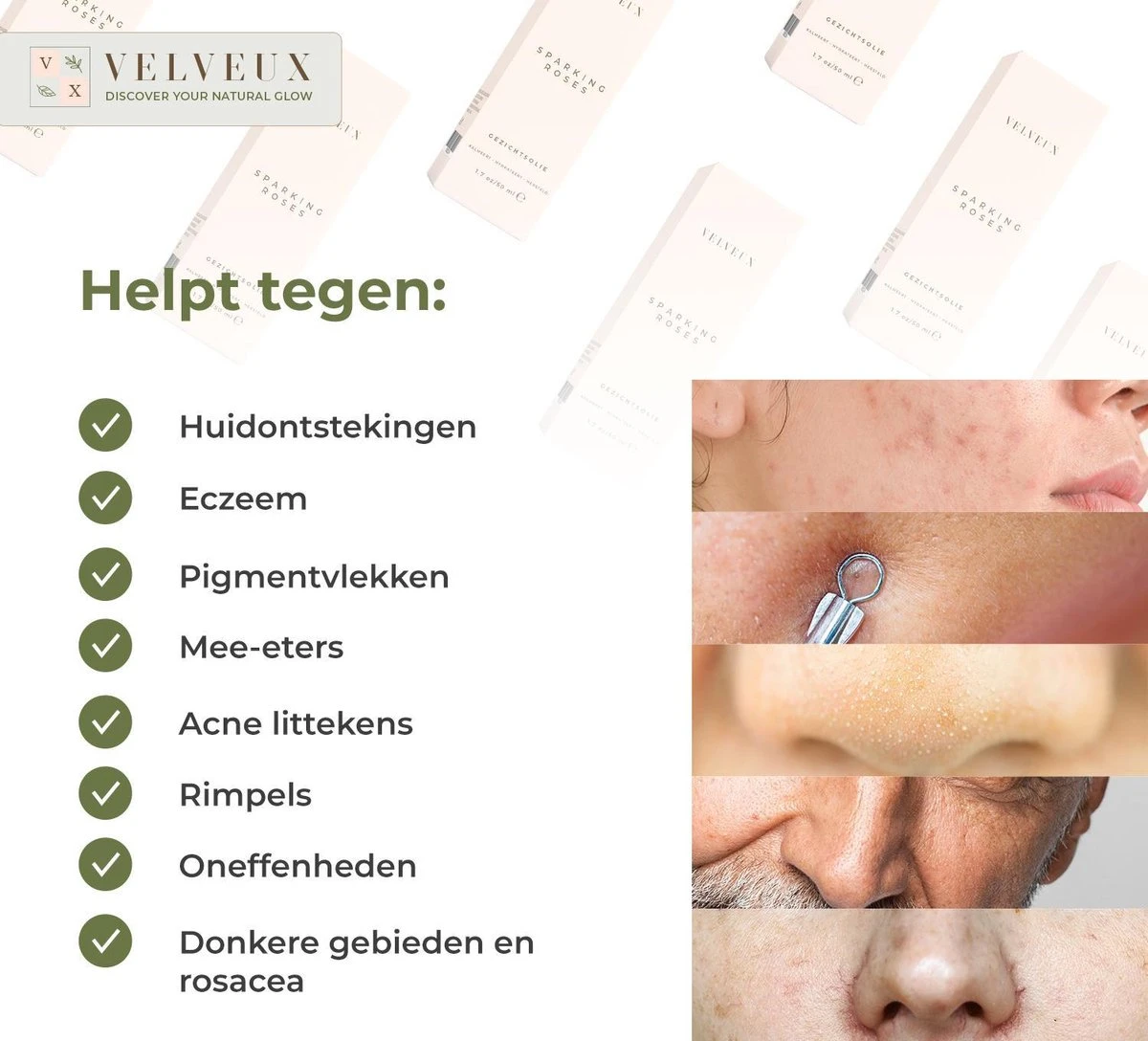 Ben je opzoek naar een gezichtsolie serum die al jouw huidproblemen aanpakt? Bijna iedereen heeft wel eens last van pigment vlekken, rimpels, droge plekken of oneffenheden. Verlang je naar een zachte, egale huid? Dat kan met het rozenolie serum van Velveux. Dit serum pakt alle problemen aan en zal het verzorgen van de huid een stuk gemakkelijker voor je maken.