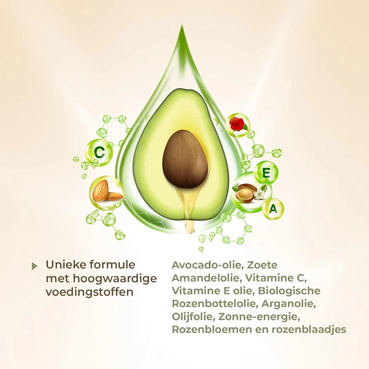 - Ingrediënten: Avocado olie, zoete amandelolie, Vitamine E olie, Vitamine C, Organische Rozenbottel olie, Argan olie, olijfolie, Zonne-energie, gedroogde rozen.