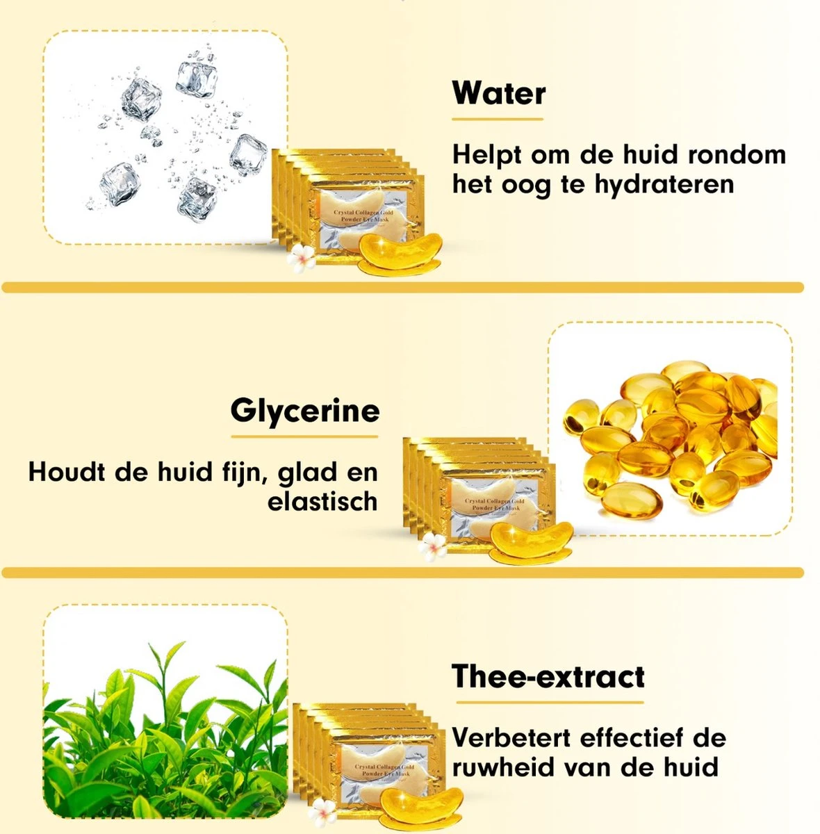 Hyaluronzuur: Het hyaluronzuur in het oogmasker geeft direct en langdurig vocht aan de huid rond de ogen en houdt het op de huid. Door het effect ziet u er jonger uit en voelt u zich jonger.