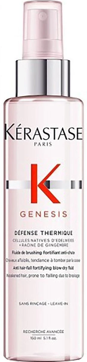 Kérastase Genesis Défense Thermique Antihaaruitval-leave-in voor verzwakt haar versterkt gevoelig haar en vermindert haaruitval. De vloeibare formule biedt antibreukbescherming en hittebescherming tot 220°C. Het haar is verzekerd van een optimale hydratatie zonder frizz. De treatment is verrijkt met Edelweiss Stamcellen en Gemberwortel voor een diepe voeding van de vezel.