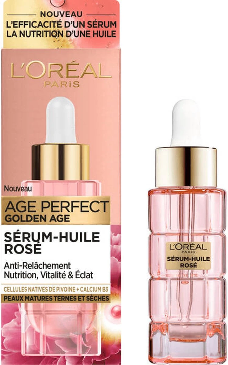 Het L’Oréal Paris Age Perfect Golden Age Rozig Olie-serum met pioenrooscellen en calcium B3 geeft je huid een glow en stevigheid. Het biedt het effect van een serum en de voeding van een olie. De formule is ontwikkeld voor de specifieke behoeften van de droge en doffe, rijpere huid. Het serum dringt snel door in je huid voor een optimale werking. Je huid voelt direct zachter aan. De voordelen van het L’Oréal Paris Age Perfect Golden Age Rozig Olie-serum: – Rijk zoals een olie voor intense voeding – Dringt snel door tot in je huid voor maximale doeltreffendheid – Verslapping is verminderd – Je huid voelt gevoed en gerevitaliseerd en ziet er stralender uit