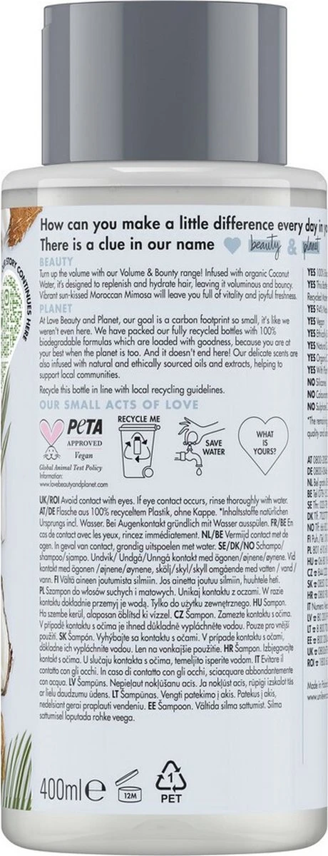 Love Beauty and Planet Coconut Water & Mimosa Volume & Bounty shampoo geeft fijn haar een volumeboost en heeft een hydraterende werking. Deze milde volume shampoo is gemaakt met natuurlijke, duurzame ingrediënten, zoals kokoswater en mimosa bloesem uit de Marokkaanse Khemisset-regio. Bij Love Beauty and Planet geloven we in effectieve natuurlijke verzorgingsproducten, ofwel in beauty zonder concessies. Vanaf nu kun je met elke douche een klein verschil maken voor de planeet. Zo zijn al onze flessen gemaakt van 100% gerecycled plastic. De vegan shampoo is 100% biologisch afbreekbaar en bestaat voor 94% uit ingrediënten van natuurlijke oorsprong (de overige 6% is om de kwaliteit en veiligheid van het product te garanderen). Goed voor jou en goed voor de planeet. Je weet hoe het werkt: knijp in de fles, laat je haar schuimen en spoel uit. Gebruik niet meer water dan nodig. Verwen je haar na het wassen met de Love Beauty and Planet Coconut Water & Mimosa Volume & Bounty conditioner. Probeer ook eens onze huidverzorgingsproducten, zoals onze Coconut Water & Mimosa showergel en bodylotion voor een gehydrateerde en zachte huid. Ons assortiment bestaat uit 6 heerlijk ruikende lijnen met ingrediënten van natuurlijke oorsprong zoals biologische kokosolie, muru muru-boter, rozenolie, ylang ylang, sheabutter en lavendel. Love Beauty and Planet combineert verzorgingsproducten met Small acts of Love voor de planeet. We werken hiervoor samen met duurzame lokale ondernemers die zich, net als wij, inzetten voor het hergebruik van materialen. Zo zetten we samen een mooie beweging in gang. Doe je mee?