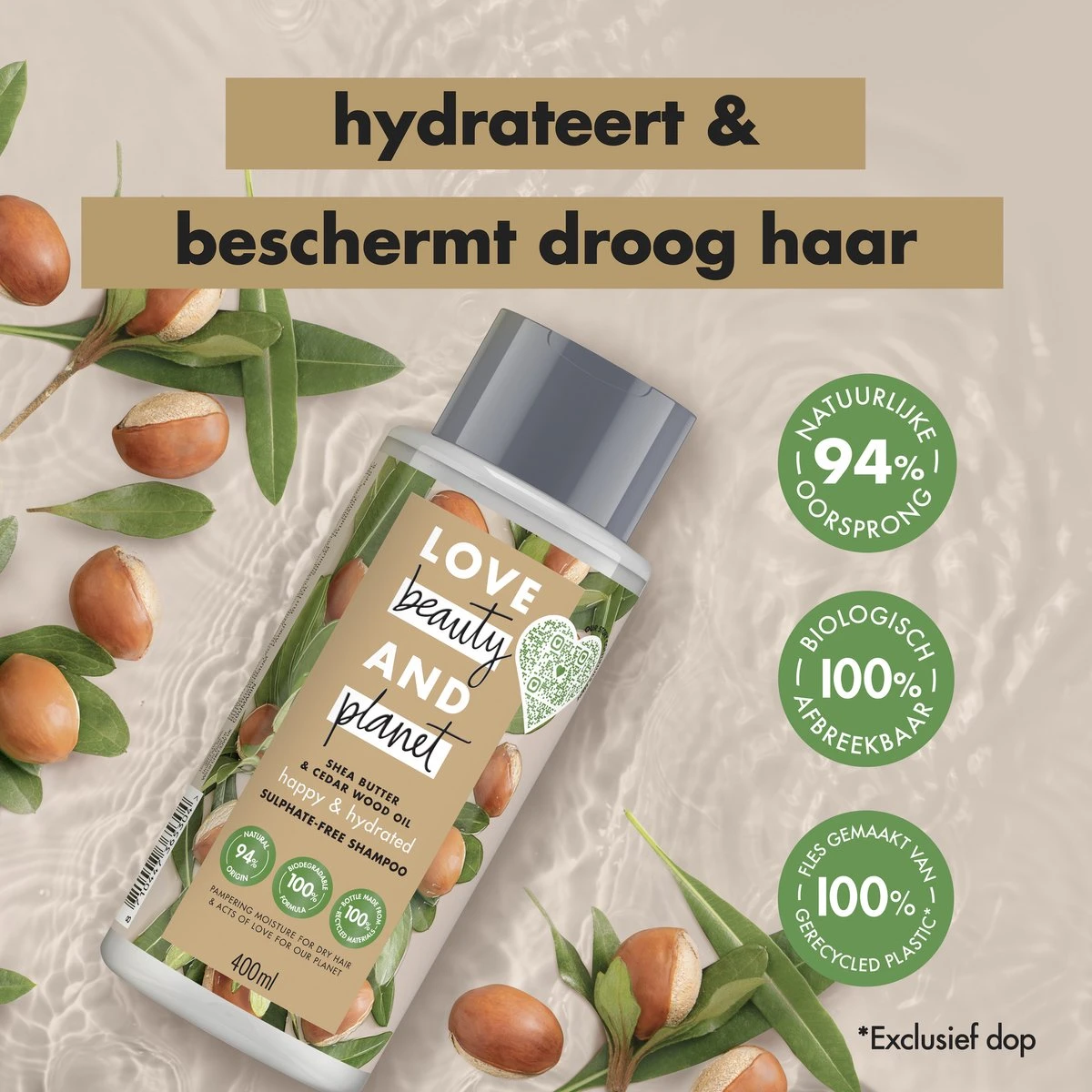Love Beauty and Planet Shea Butter & Cedar Wood Oil Happy & Hydrated shampoo biedt verzorgende hydratatie voor droog haar, 100% biologisch afbreekbaar.