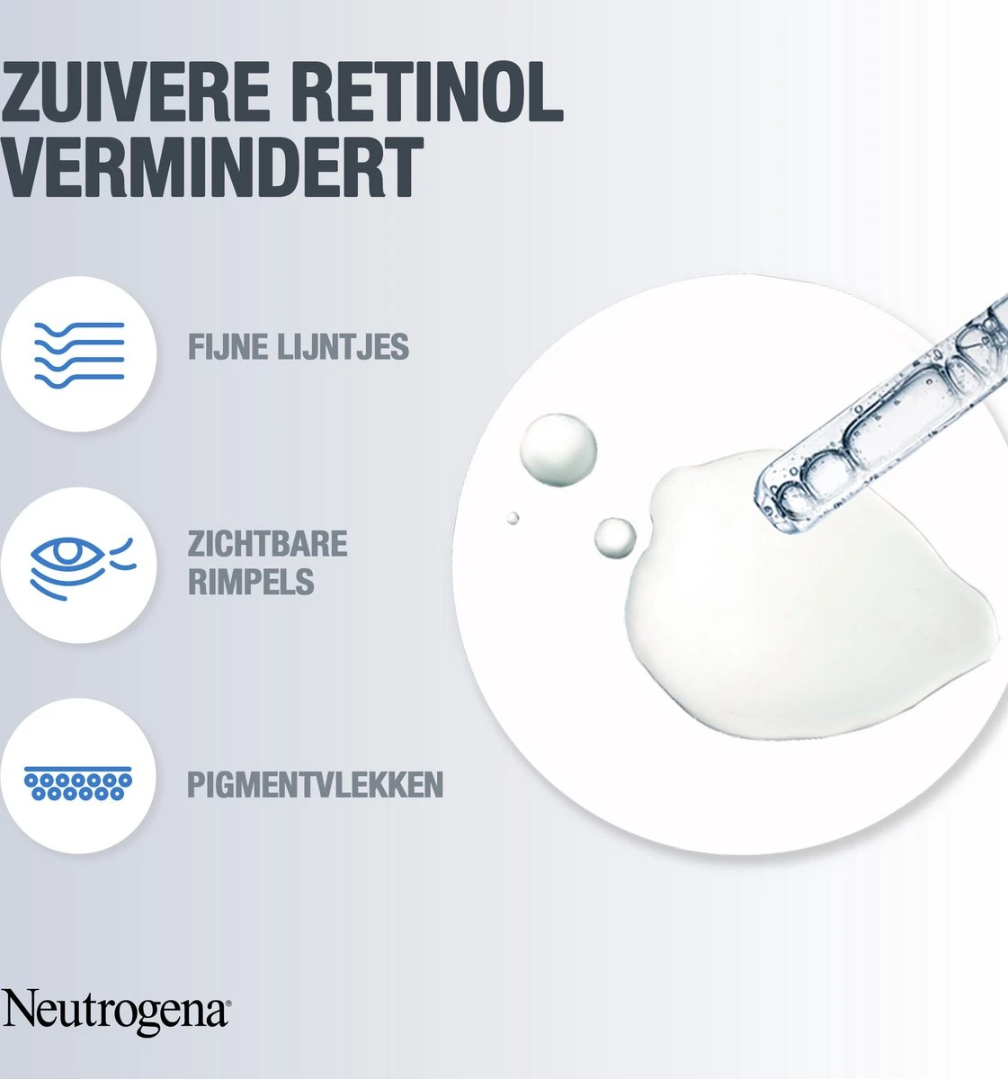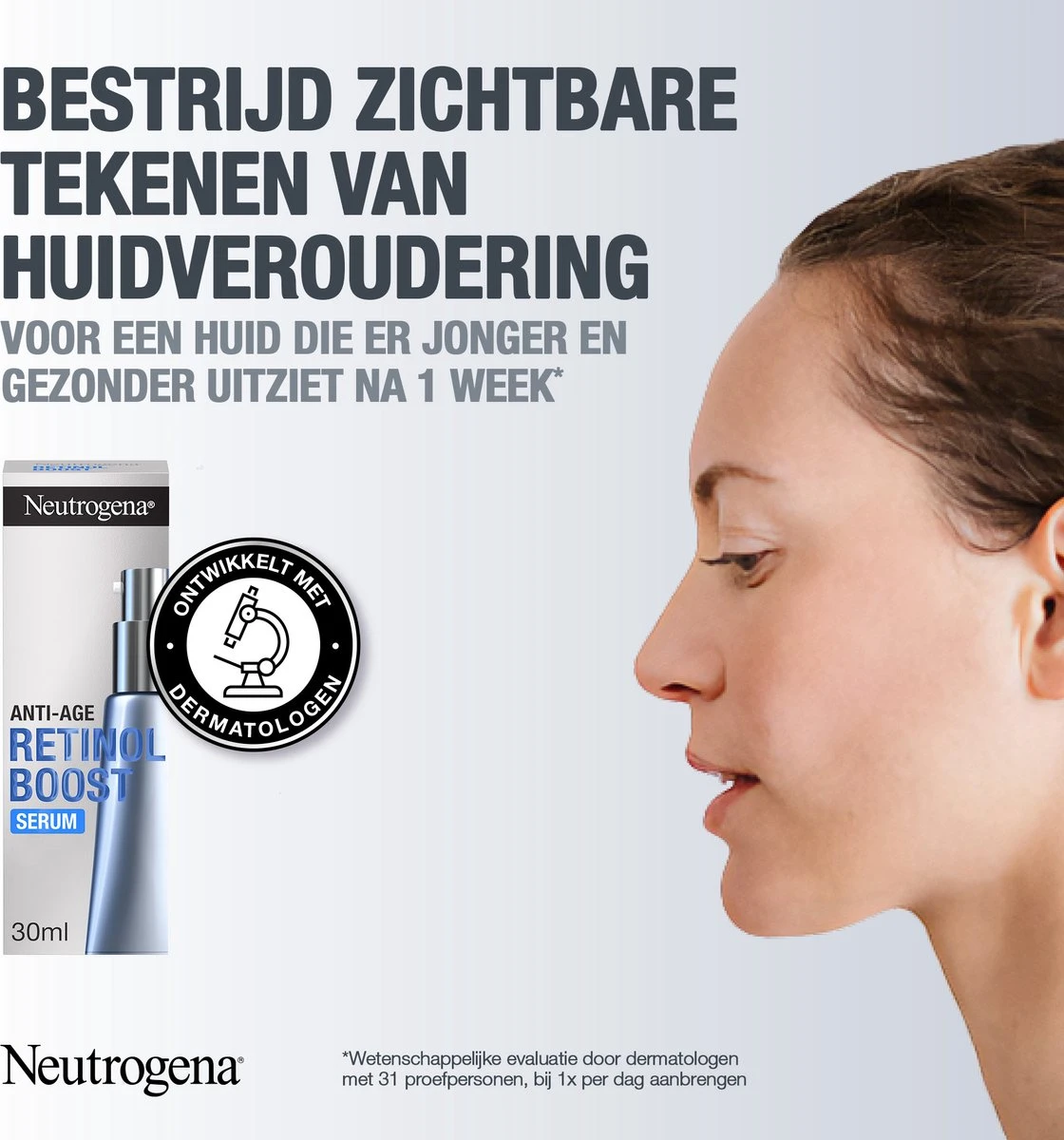 - Neutrogena Retinol Boost Serum vermindert zichtbare tekenen van huidveroudering: rimpels, verminderde stevigheid, vermoeide huid en pigmentvlekken. Dit verzorgingsserum zorgt voor een jongere, gezonder uitziende huid al na 1 week
