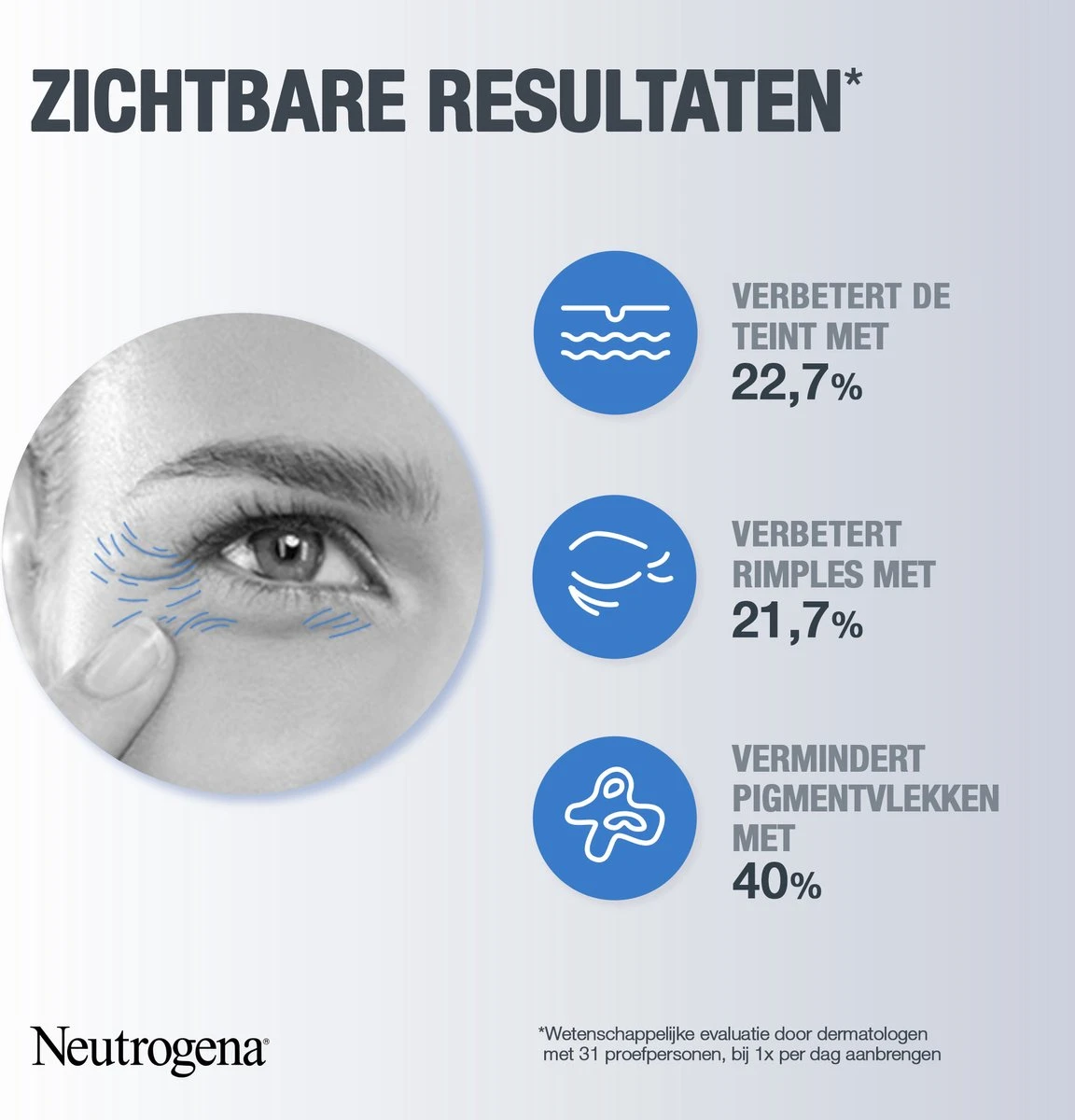 Het Neutrogena Retinol Boost Serum is een uiterst effectief anti-aging gezichtsserum met pure Retinol, mirtebladextract en hyaluronzuur, voor een jongere en gezond uitziende huid. Het gezichtsserum bestrijdt zichtbare tekenen van huidveroudering: rimpels, verminderde strakheid, vermoeide huid, droogheid en pigmentvlekken. Daarnaast verbetert dit anti-aging serum het huidbeeld, zorgt voor een gelijkmatige teint en maakt de huid gladder. De unieke formule combineert pure Retinol om de collageenproductie te bevorderen, mirtebladextract om de effectiviteit van Retinol te verhogen en hyaluronzuur voor intensieve vochtigheid en een vollere huid. Het anti-aging gezichtsserum is zo effectief dat bij 100% van de proefpersonen na 1 week een zichtbare werking bevestigd werd*. Gebruik: Doe 1x per dag 2 pompjes van het serum aan op je hand en masseer het daarna zacht in op uw gezicht en hals. (*Wetenschappelijke evaluatie door dermatologen met 31 proefpersonen, bij 1x per dag aanbrengen)
