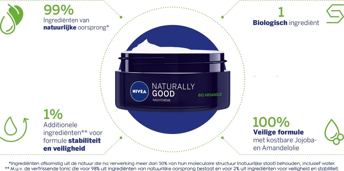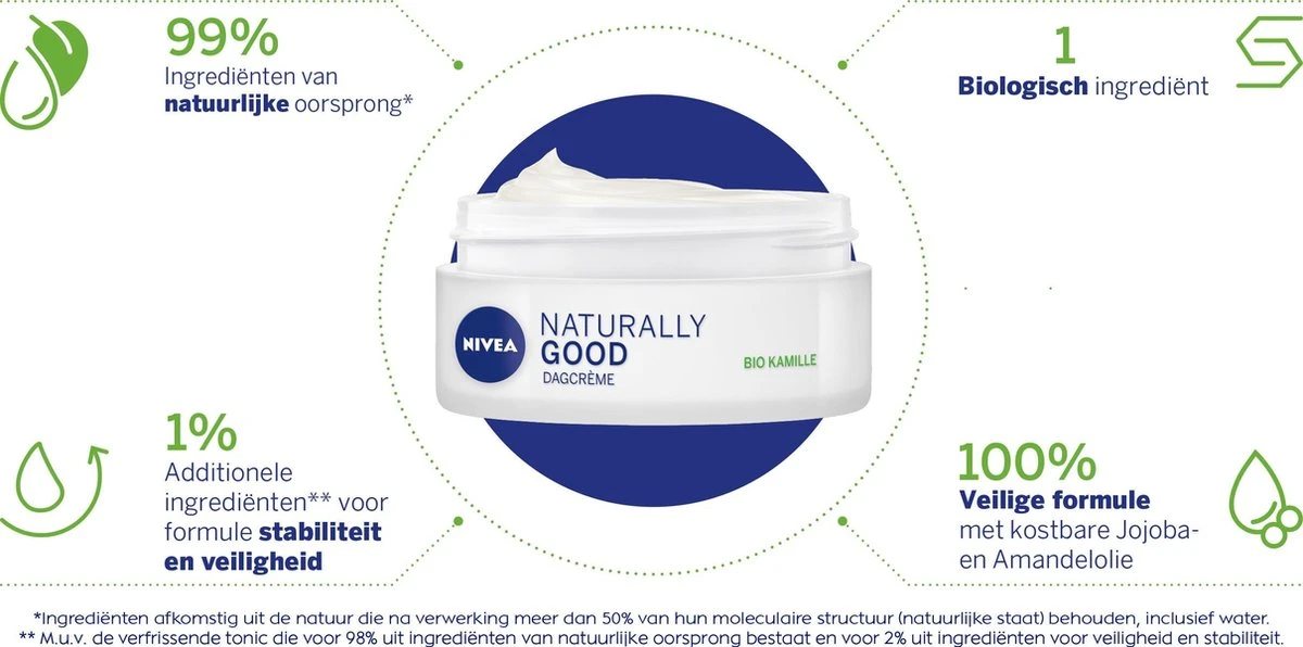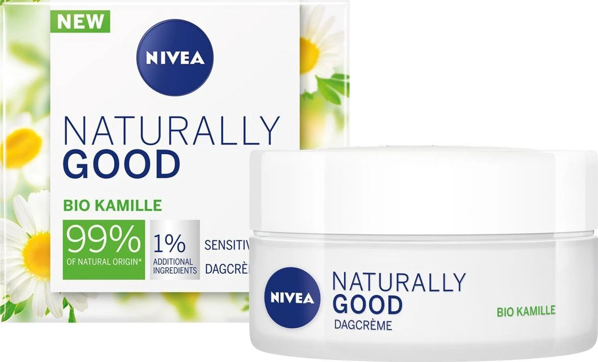 NIVEA Naturally Good Dagcrème Sensitive is gemaakt met uw gevoelige huid in gedachten. De formule met 99% ingrediënten van natuurlijke oorsprong* en 1% additionele ingrediënten voor formule stabiliteit en veiligheid is bijzonder mild voor uw huid. De dagcrème hydrateert je huid gedurende 24 uur en kalmeert huidirritaties en vermindert zichtbaar roodheid. De dagcrème met bio Kamille geeft onmiddellijke verlichting van een trekkerig gevoel en is parfumvrij. Huidvriendelijkheid dermatologisch goedgekeurd.