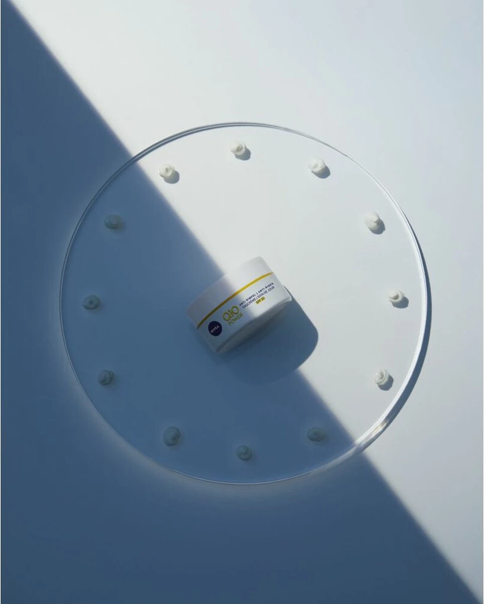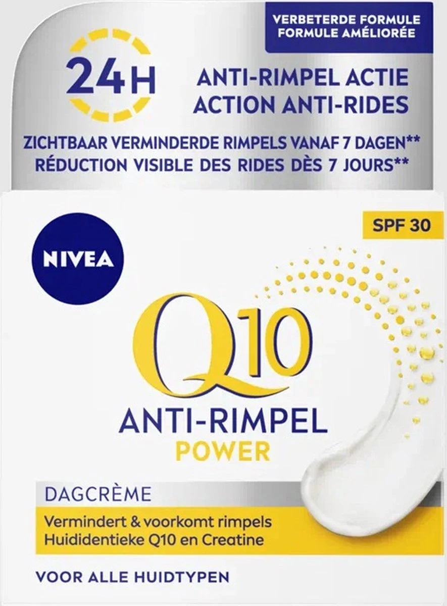 NIVEA Q10POWER Anti-Rimpel Dagcrème SPF30 combineert het cel-actieve Q10 met 10X meer Creatine vergeleken met voorgaande formules. Het bestrijdt effectief fijne lijntjes en rimpels en zorgt voor een voelbaar stevigere huid. SPF30 en UVA/UVB bescherming helpen het ontstaan van nieuwe rimpels door invloeden van buitenaf te voorkomen. De verzorgende formule zorgt bovendien voor intensieve hydratatie.