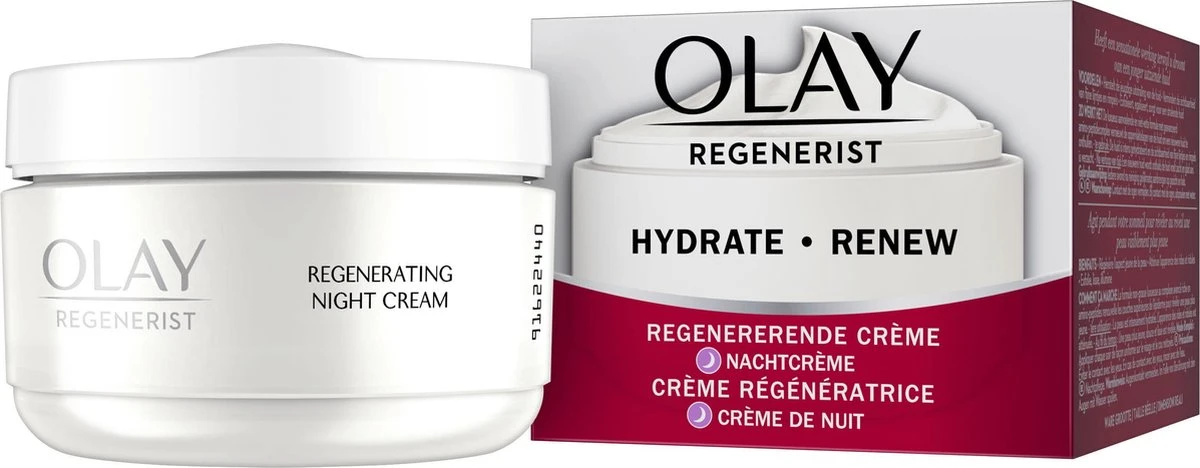 Olay Regenerist Regenererende Nachtcrème werkt als een droom voor een jonger uitziende huid. Herstelt de jeugdige uitstraling van de huid. Vermindert de zichtbaarheid van fijne lijntjes en rimpels. Exfolieert, egaliseert, zorgt voor een stralende huid. Luxueus gevoel en niet-vettige formule met geavanceerd amino-peptidecomplex vernieuwt het huidoppervlak en onthult een nieuwere huid. 1e gebruik: de huid wordt intens gehydrateerd en fijne lijntjes en rimpels zijn zichtbaar verzacht. Na verloop van tijd: Een nieuwere huid wordt onthuld; huid voelt zachter en gladder aan.