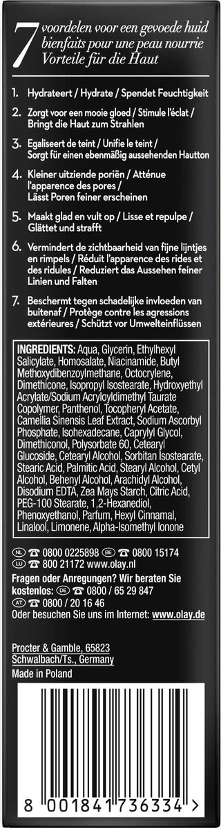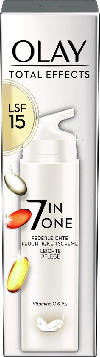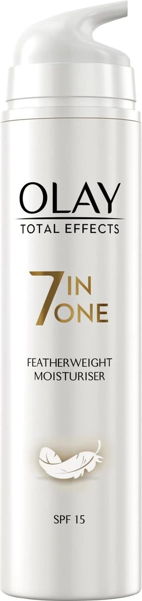 De formule van Olay Total Effects zit vol vitaminen B3, C, E en Pro-Vitamine B5, die antioxidanten bevatten en de hydratatie en vernieuwing van het huidoppervlak verbeteren.