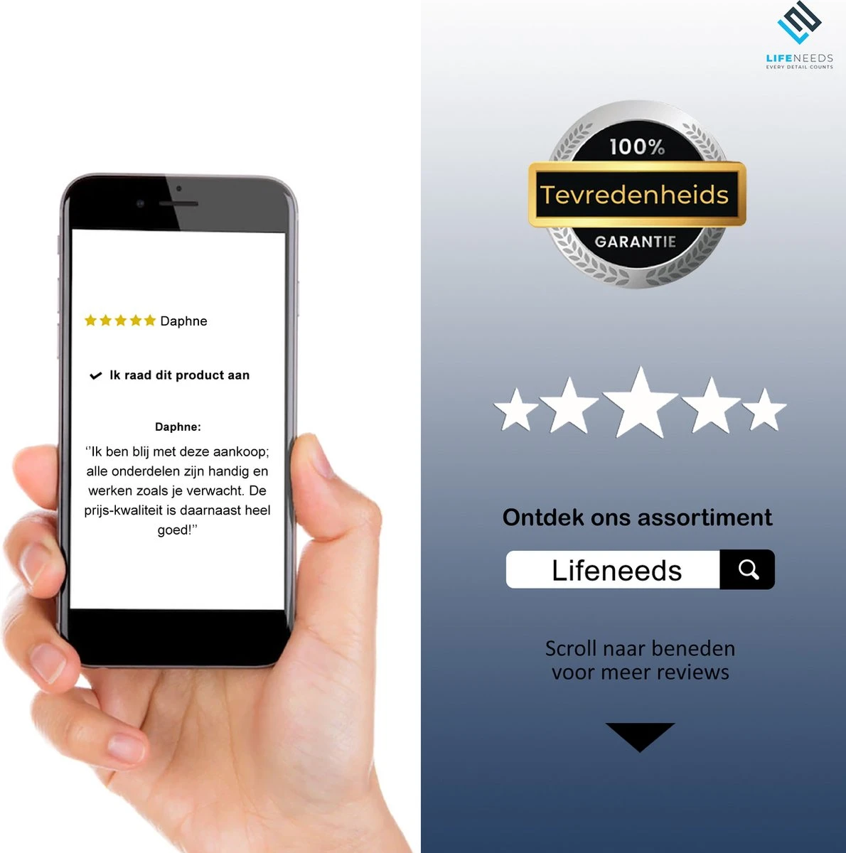 Wij staan achter onze producten en de kwaliteit ervan. Daarom gaan we ervan uit dat jij tevreden bent. Ben je onverhoopt toch niet tevreden? Geen zorgen, wij bieden een 30 dagen ‘’niet goed, geld terug’’ garantie aan en een 100% tevredenheidsgarantie.