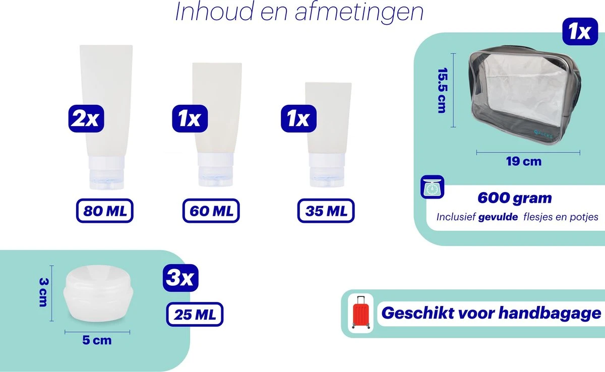 Wist je dat de 8-delige reisflesjes set van Qpacks zonder problemen meegenomen mag worden in de hangbagage tijdens vliegreizen? De inhoud van de flesjes en potjes is minder dan 100 ML en voldoet daardoor aan de internationale eisen voor het meenemen van vloeistoffen in de handbagage.