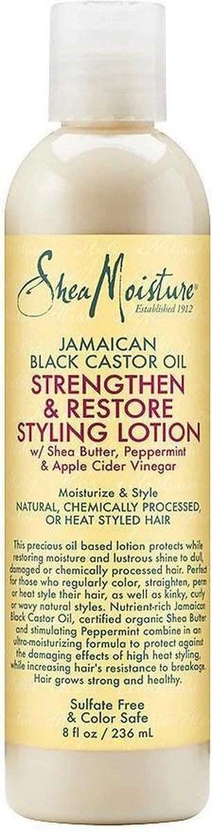 Shea Moisture Jamaican Black Castor Oil Strengthen, Grow & Restore Styling Lotion, een op olie gebaseerde lotion die het haar beschermt, terwijl het het haar versteld van vocht en glans. De ultra-hydraterende formule beschermt het haar tegen de schadelijke effecten van thermische styling. Verhoogt de weerstand van het haar zonder het te breken, zodat het haar sterk en gezond kan groeien.