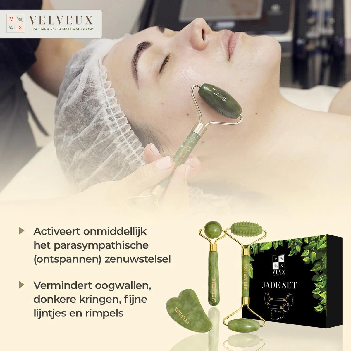 Bestel nu jouw Jade roller en Gua Sha set van Velveux en ervaar zelf de magie van deze krachtige routine.